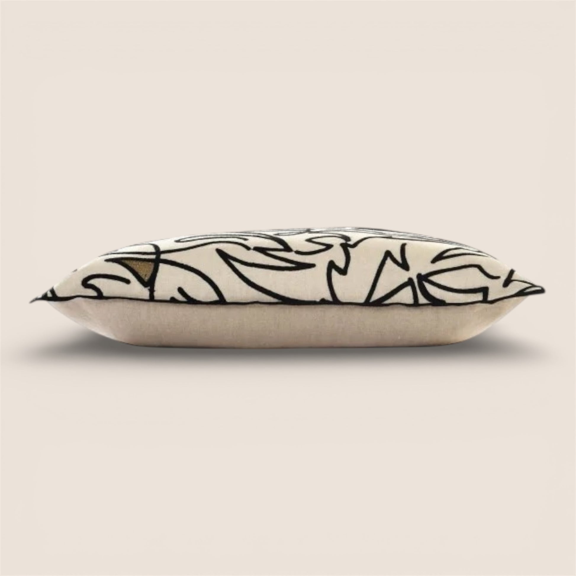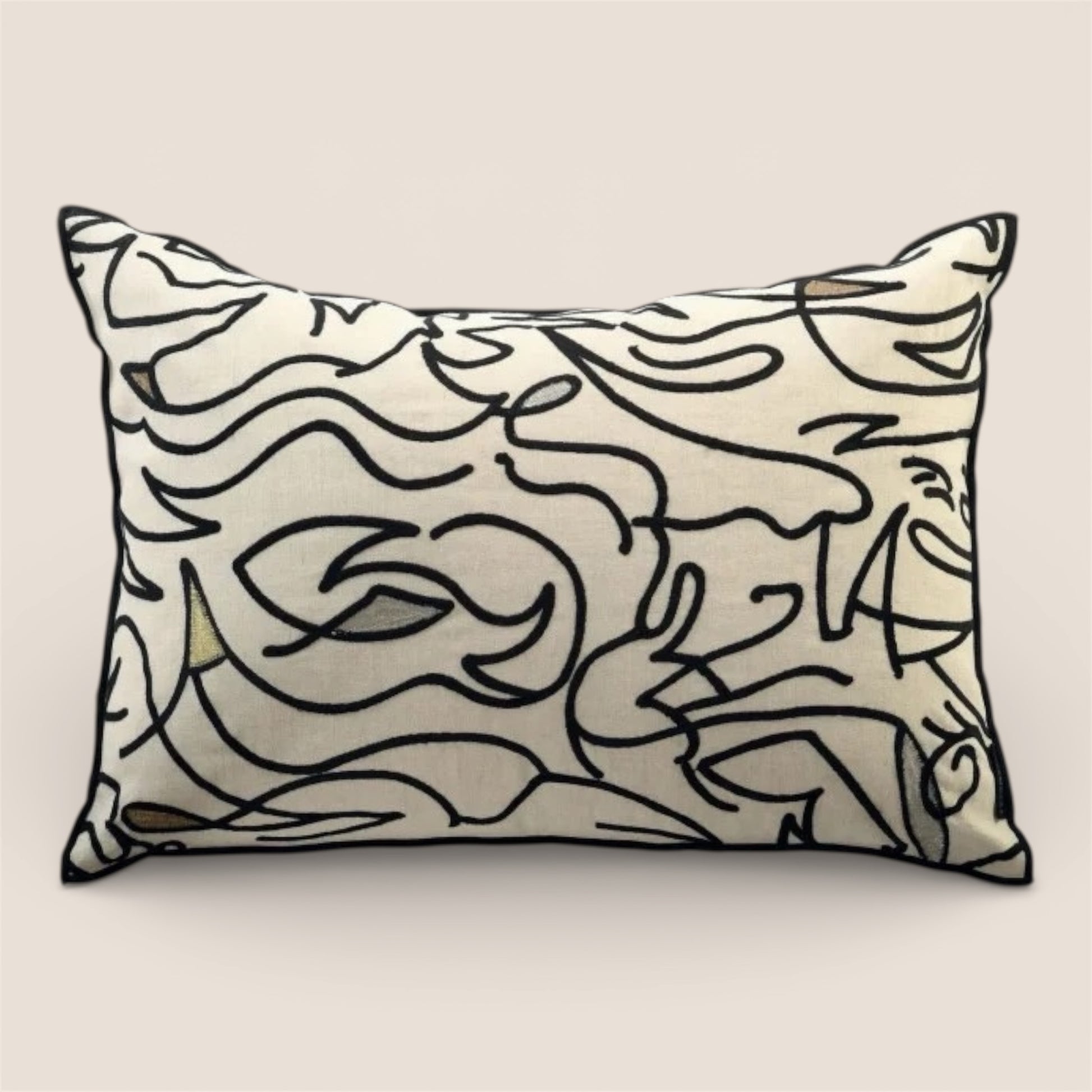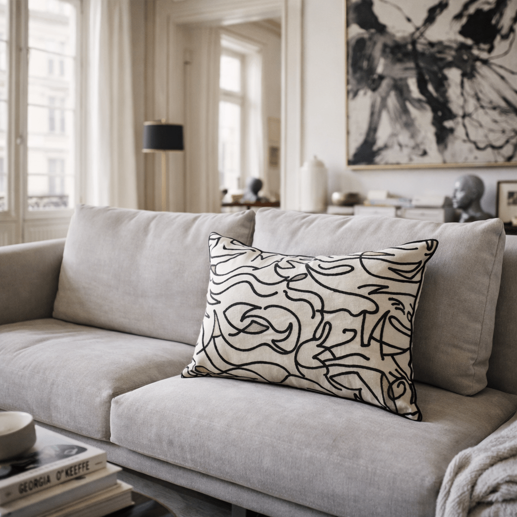 Klare, freie Linien bewegen sich wie eine skizzenhafte Komposition über den ruhigen Leinenfond und verleihen dem Kissen eine moderne, künstlerische Ausstrahlung. Die grafische Stickerei wirkt zugleich reduziert und lebendig und fügt sich harmonisch in zeitgemäße wie klassische Interieurs ein.