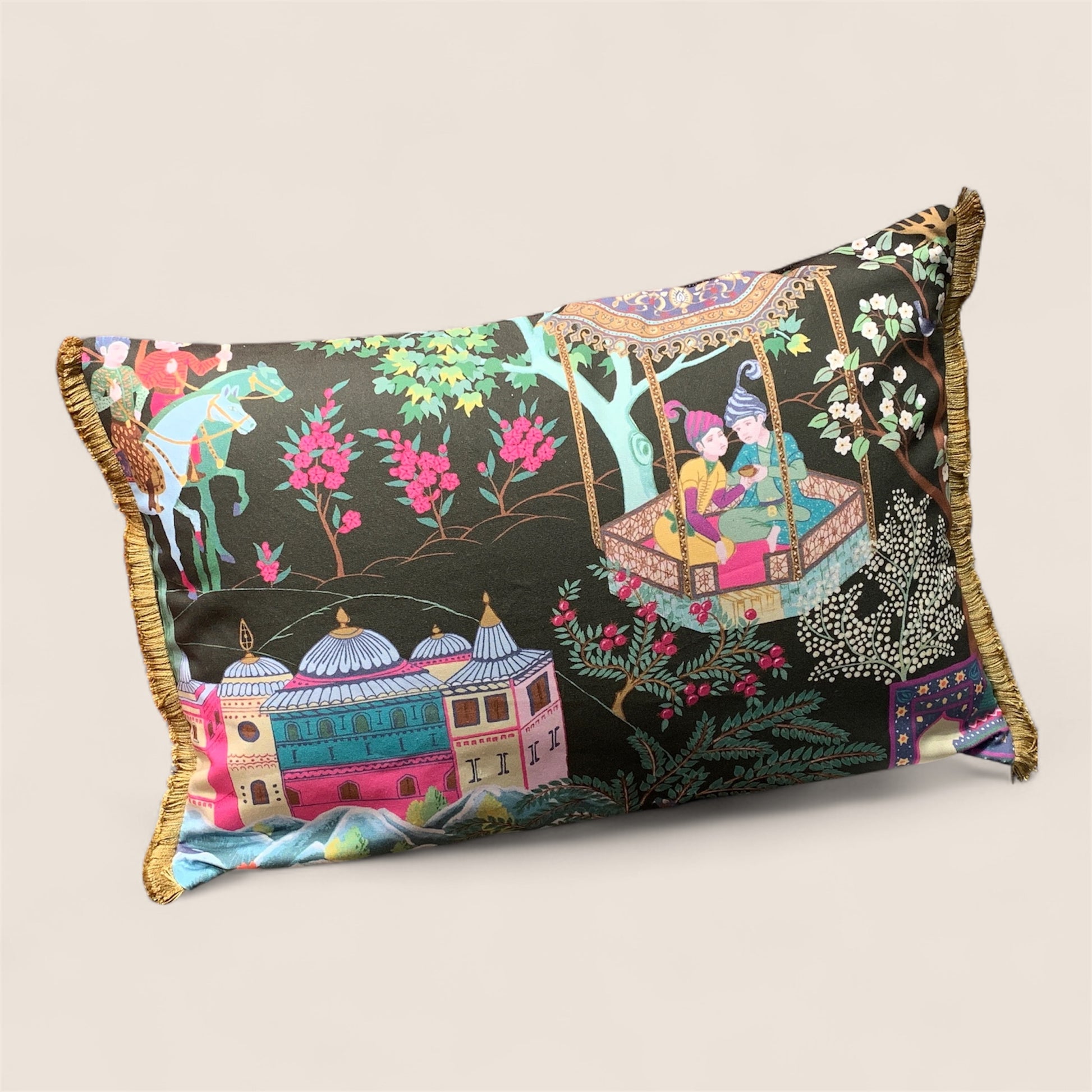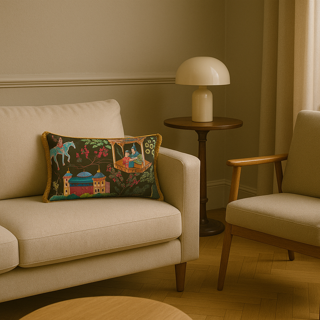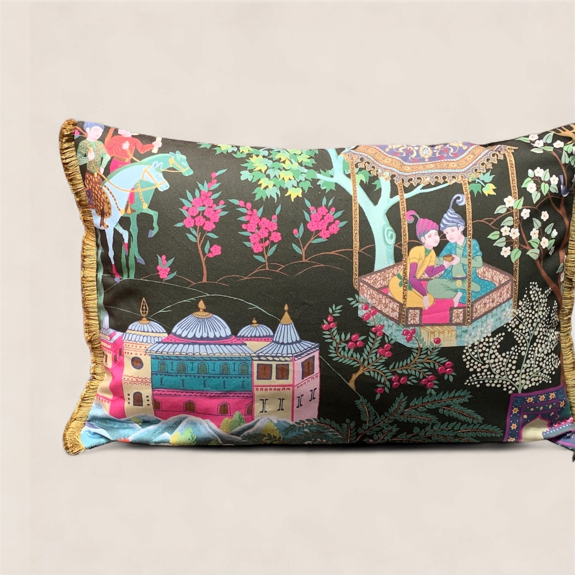 Ein Hauch von Exotik, eingefangen in edlem Stoff. Dieses besondere Kissen wurde aus einem exklusiven Manuel Canovas Stoff gefertigt – ein Design voller lebendiger Details und farblicher Harmonie. Die Rückseite besteht aus einem passenden, einfarbigen Stoff und links und rechts betont eine feine Franse den handwerklichen Charakter.Leyla wurde in der PAYOS Polstermanufaktur in Wiesbaden mit Liebe und Präzision gefertigt.